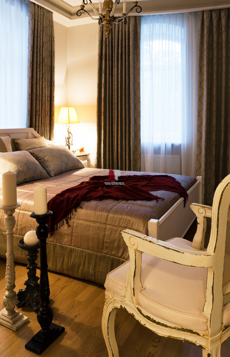 Спальня дедушки в пастельных тонах. Кресло, кровать, тумбочки, комод, WonderWood. Настольные лампы, Mis en Demeure. Люстра, Savoy House.
