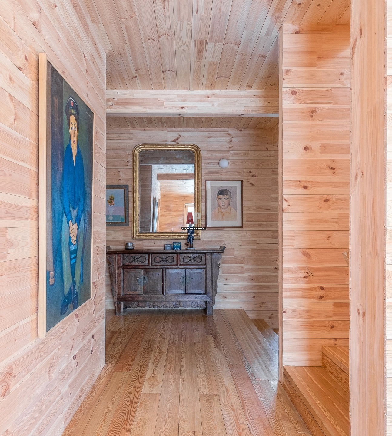 Главная роль в интерьере отведена картинам, поэтому отделка не пестрит разнообразием, а выглядит единой композицией. Стены и потолок всех помещений зашиты сосновой доской натурального цвета, на полу – доска из лиственницы также природного светлого оттенка.