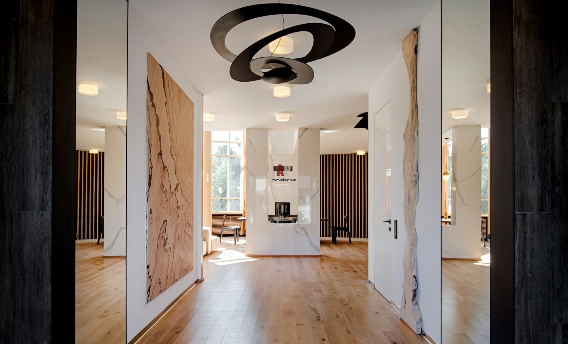 Входная группа выглядит парадной за счет большого пространства, открытых перспектив и симметричного оформления. Гардеробные шкафы скрыты за зеркалами, установленными друг напротив друга под небольшим углом. Панно стенах – слэб из песчаника и вертикальный распил ствола тополя, использованные в качестве декора. Керамогранит с фактурой камня, Rex.