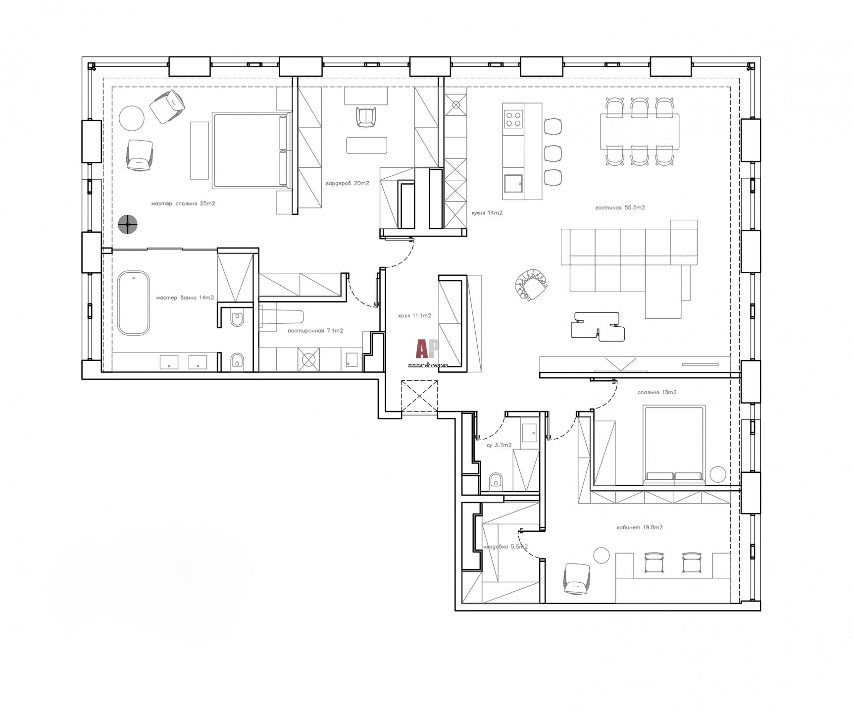 План четырехкомнатной квартиры в ЖК «Воробье дом». Общая площадь – 200 кв. м.