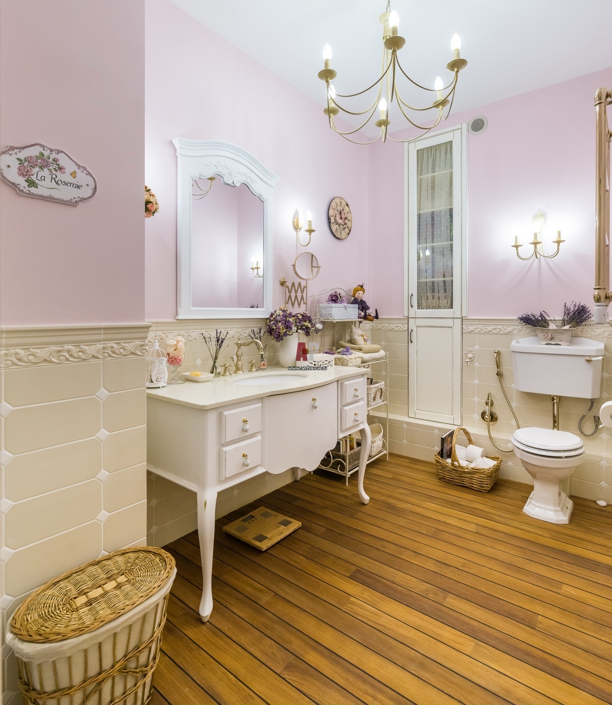 Ванная комната (площадь – 7,62 кв. м) в кремово-розовых тонах. Низ стен облицован керамической плиткой Ceramiche Grazia. На полу – палубная доска, тик.