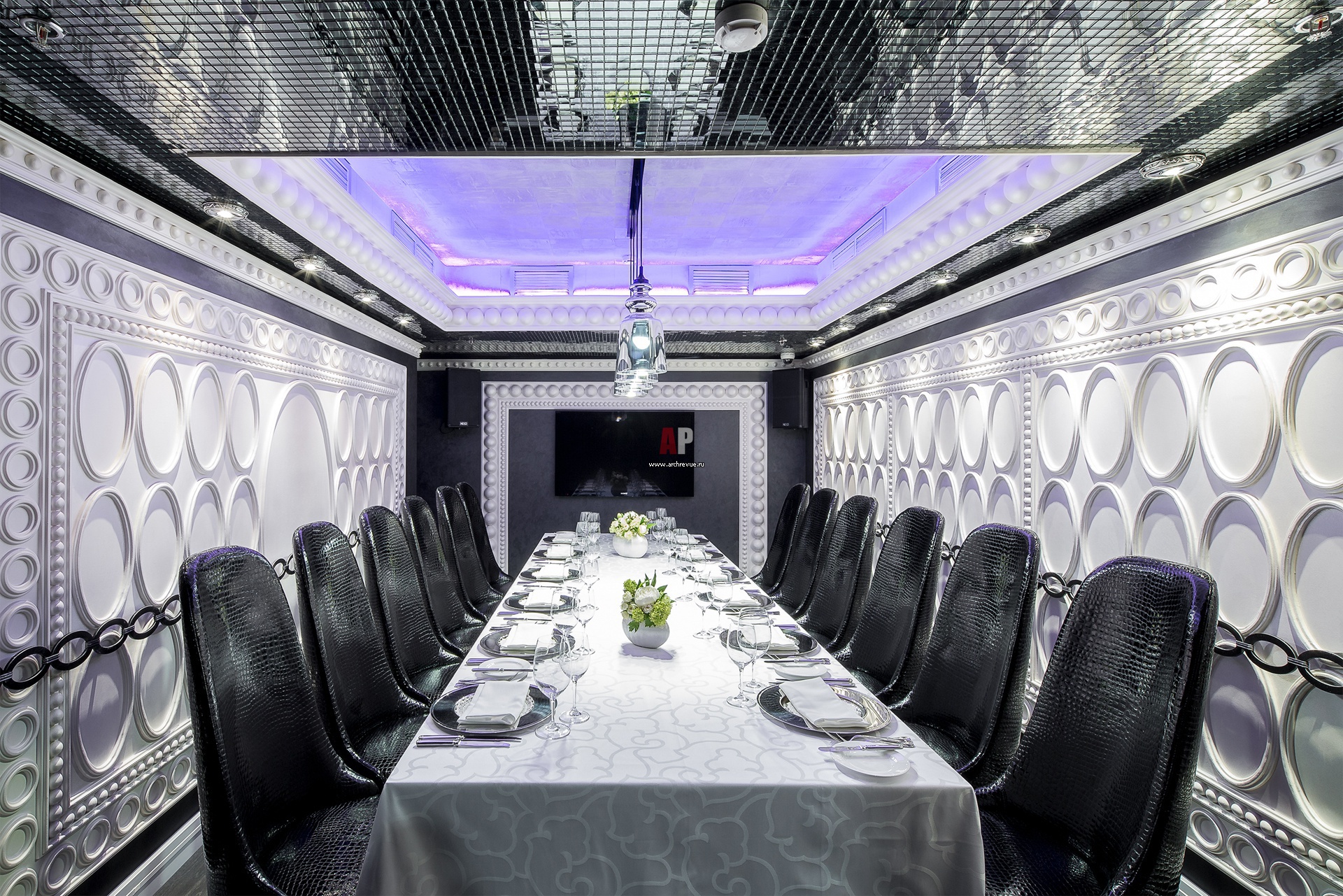 Дизайн VIP-зала дорого итальянского ресторана в стиле ар-деко. На стенах – белоснежные лепные круги, потолок облицован черной мозаикой, стулья затянуты черной кожей рептилий.