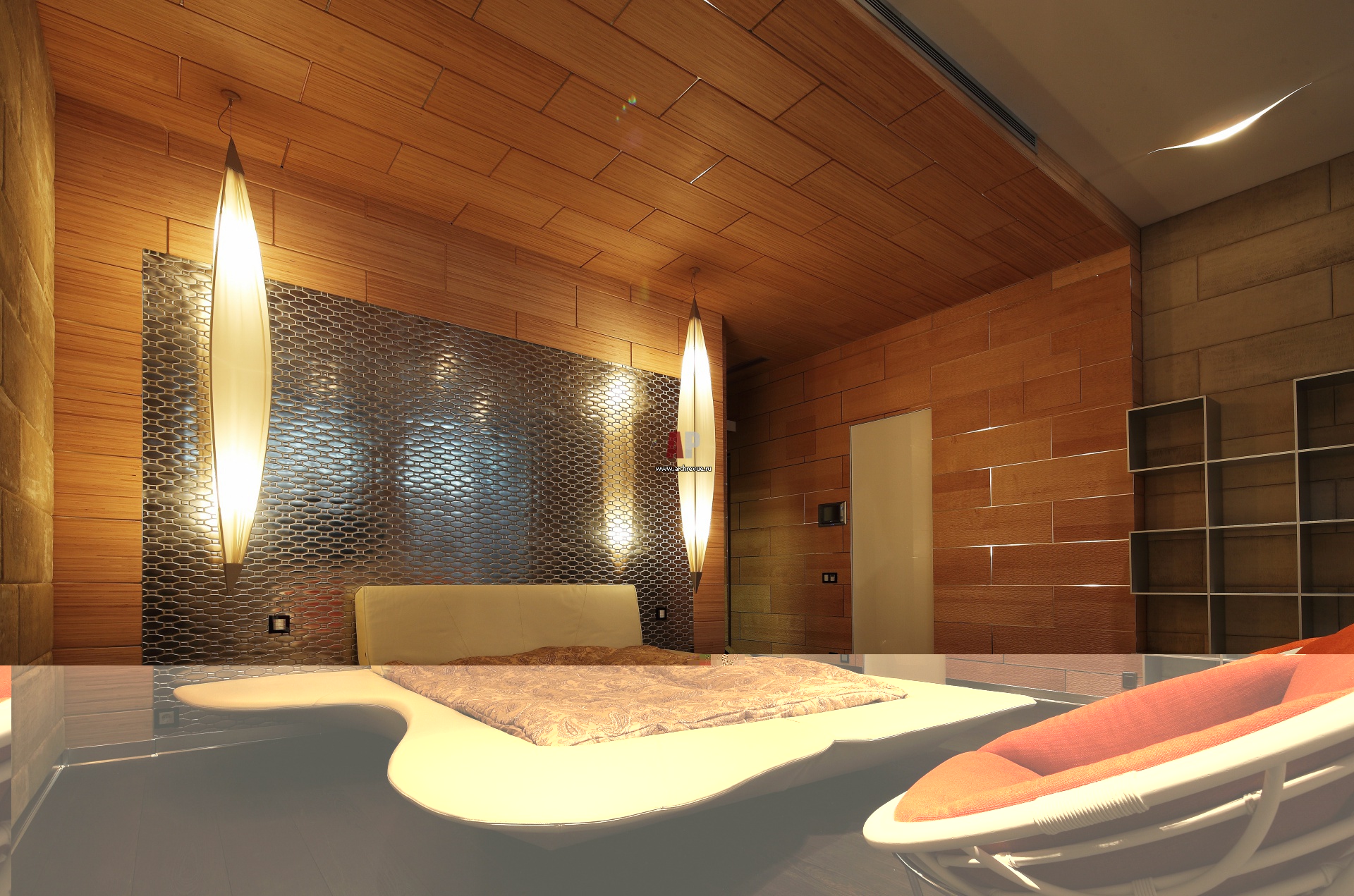 Центральный элемент спальни – кровать в форме ската от Flou в кожаной обивке. Укрепленные на потолке торшеры от Quasar отражаются в зеркальном стеновом покрытии.