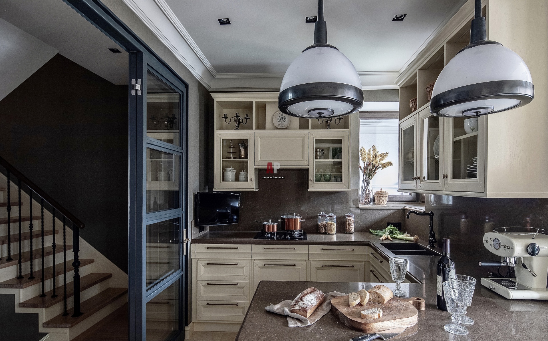 Центральное место на кухне занимает барная стойка с каменной столешницей, она служит местом для завтраков и легких перекусов.