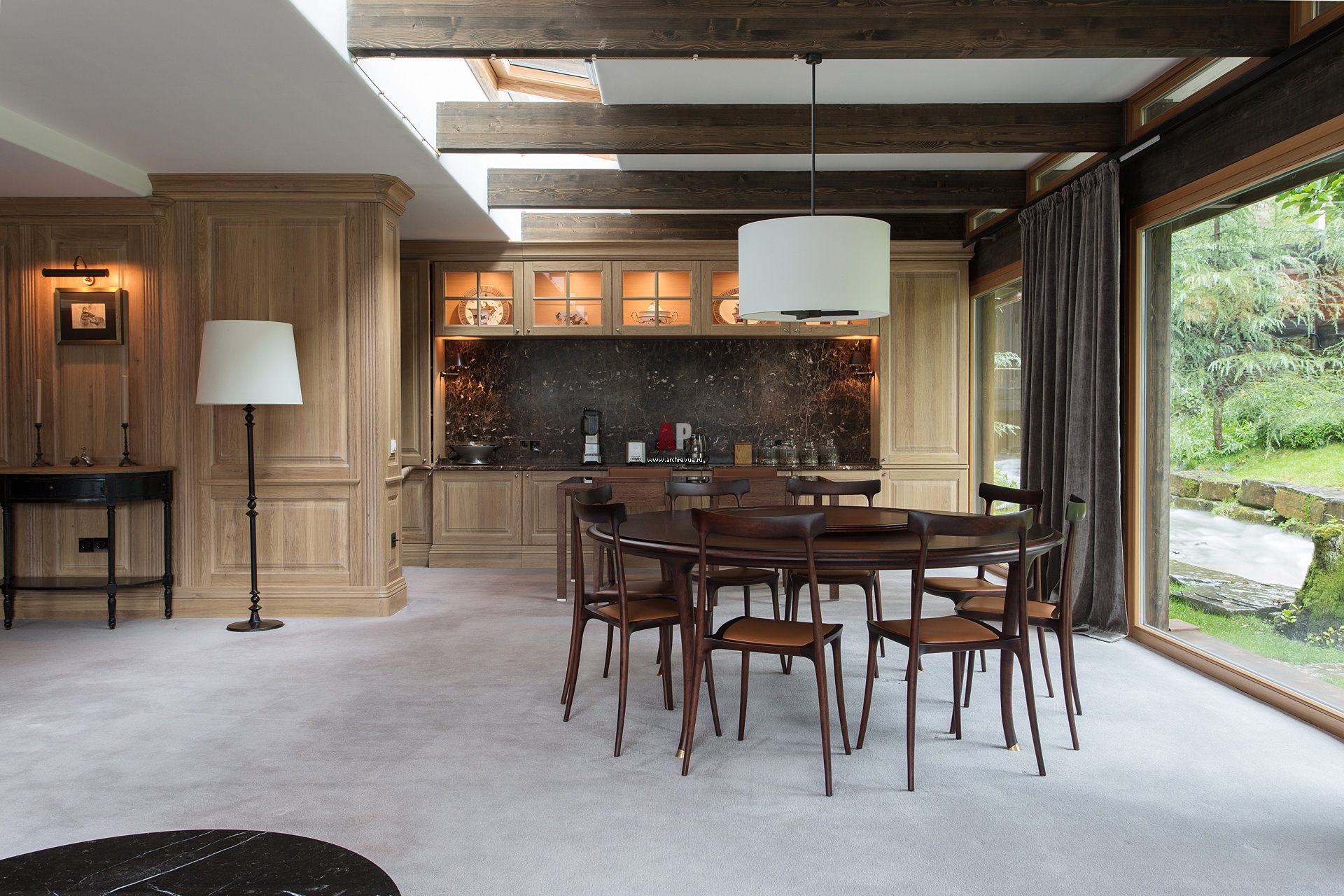 Фото интерьера столовой. Ковролин из чистой некрашеной шерсти вызывает те же тактильные ощущения, что и природный газон. Силуэты предметов столового гарнитура Ceccotti рифмуются с кустарниками и травами, которые колышет ветром.