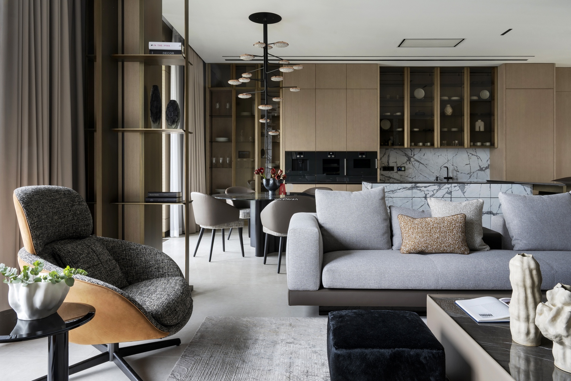 Гостиная-кухня. Пространство объединяет базовый, сквозной прием - панелирование. Чтобы переход от панелирования к корпусной мебели был идеальным, требовалось идеальное совпадение фактур, размеров, линий, поэтому почти вся мебель, кроме мягкой, изготовлена по эскизам автора проекта.
