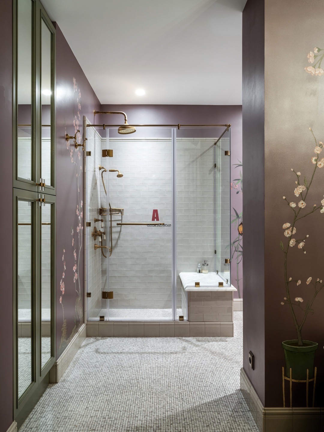 Хозяйская ванная комната. В ней есть также просторный душ со встроенной лавочкой, унитаз, биде и тумба с двумя раковинами. Свет, Visual Comfort & Co.