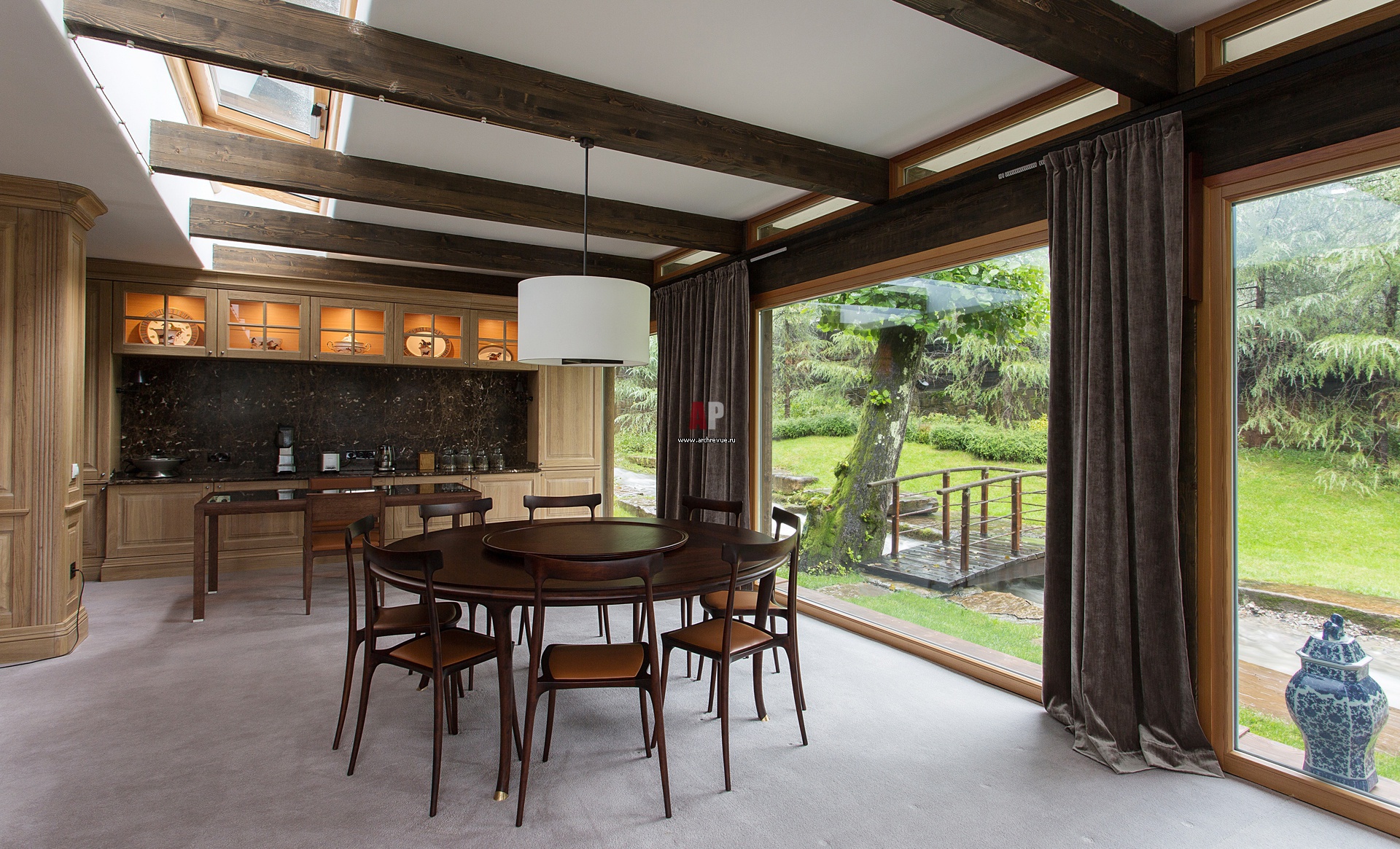 Смысловое ядро дома – открытый объем, не разделенный внутренними перегородками, он дает человеку чувствовать себя легко и свободно. Гостиная, кухня, столовая и расположенная в самом удаленном от панорамных окон месте каминная зона воспринимаются как продолжение ландшафта.