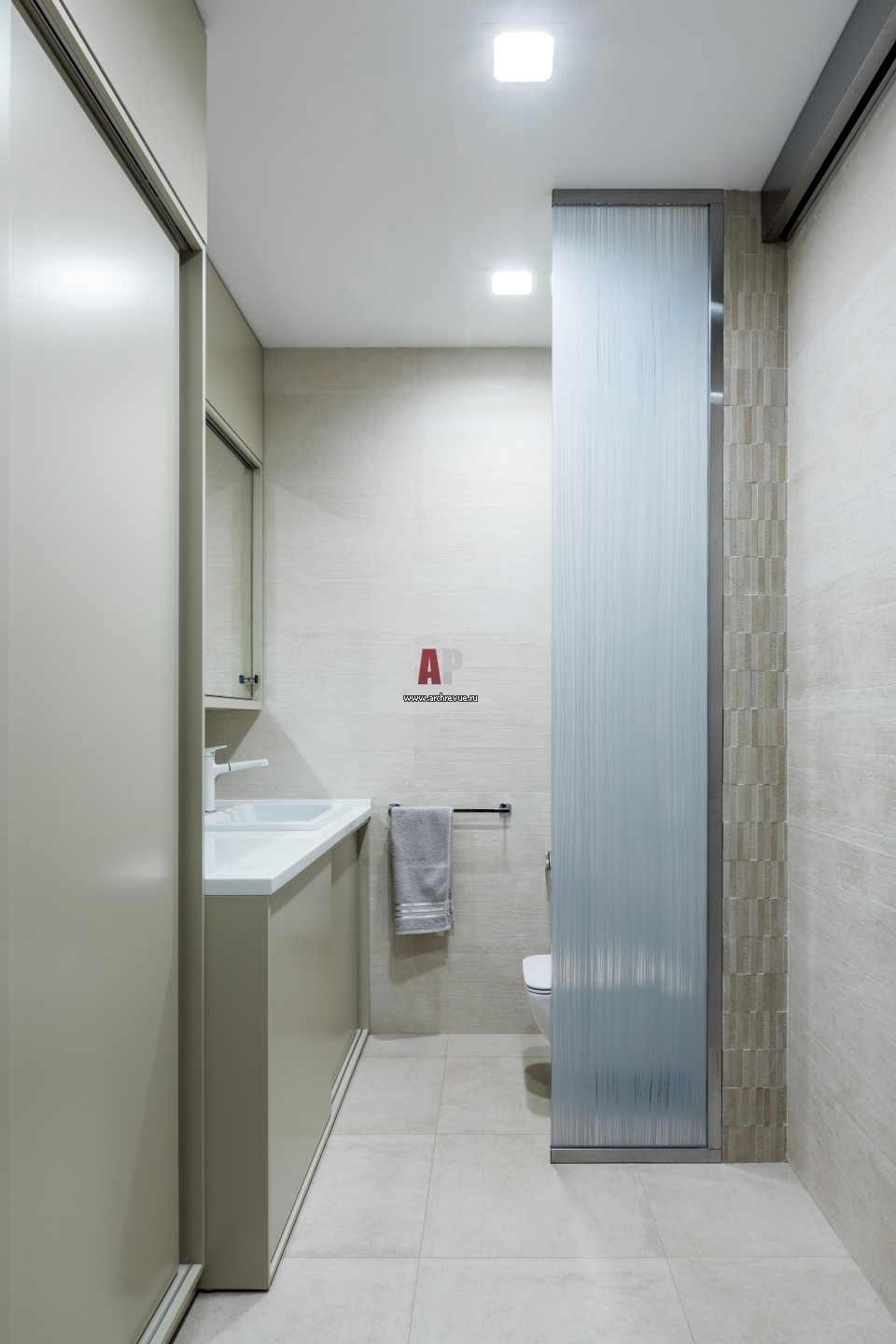 Гостевой санузел выглядит строго и даже аскетично. Зона туалета изолирована матовой перегородкой.