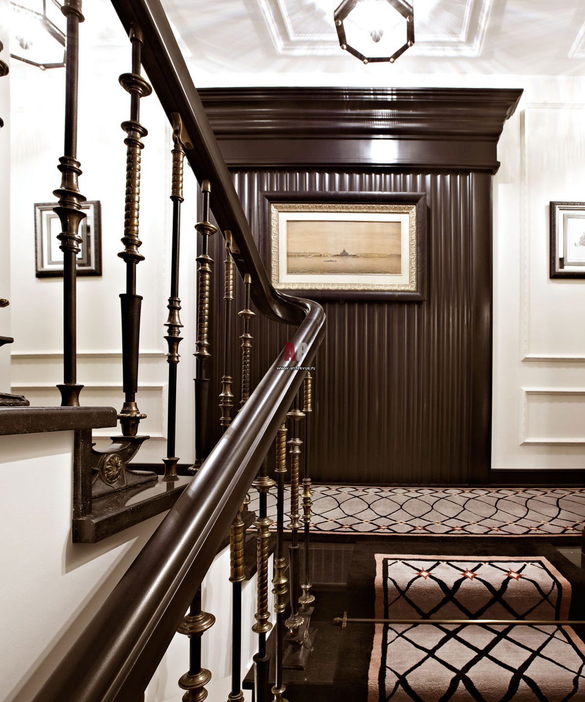 Парадная лестница выполнена из черного гранита. Ограждение (литье с элементами тонированной латуни) изготовлено по эскизам автора проекта в «Мастерская Константина Невзорова». Ковровая дорожка также выполнена по авторскому дизайну мастерами компании «Тюфенкян».