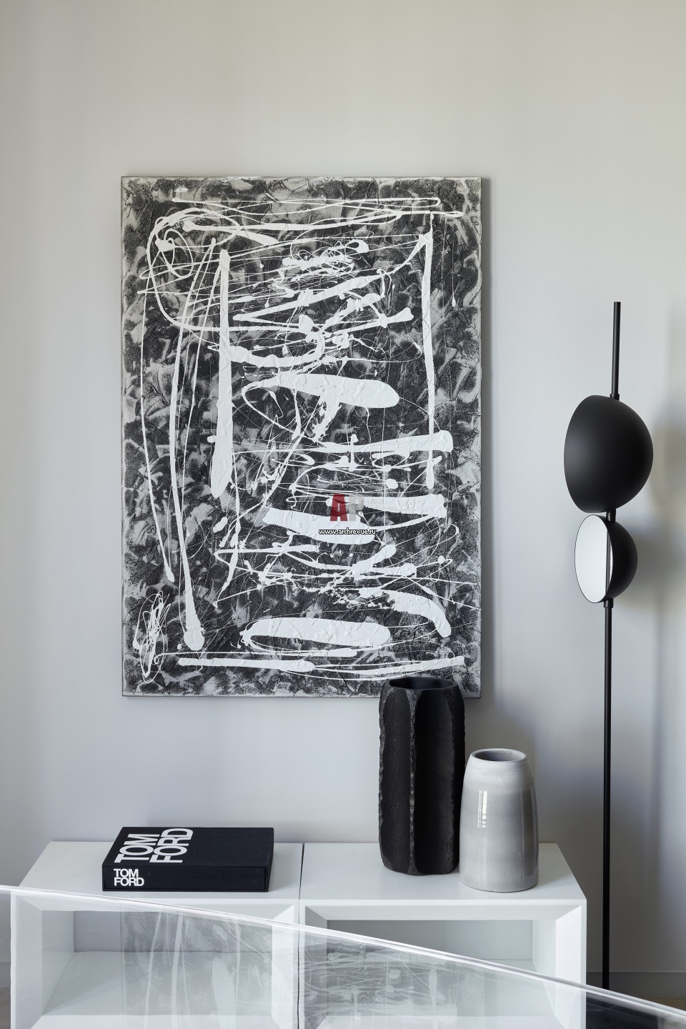 Украшение кабинета – абстрактная живопись Алексея Осина. Торшер, Oluce, по дизайну Виктора Василева.