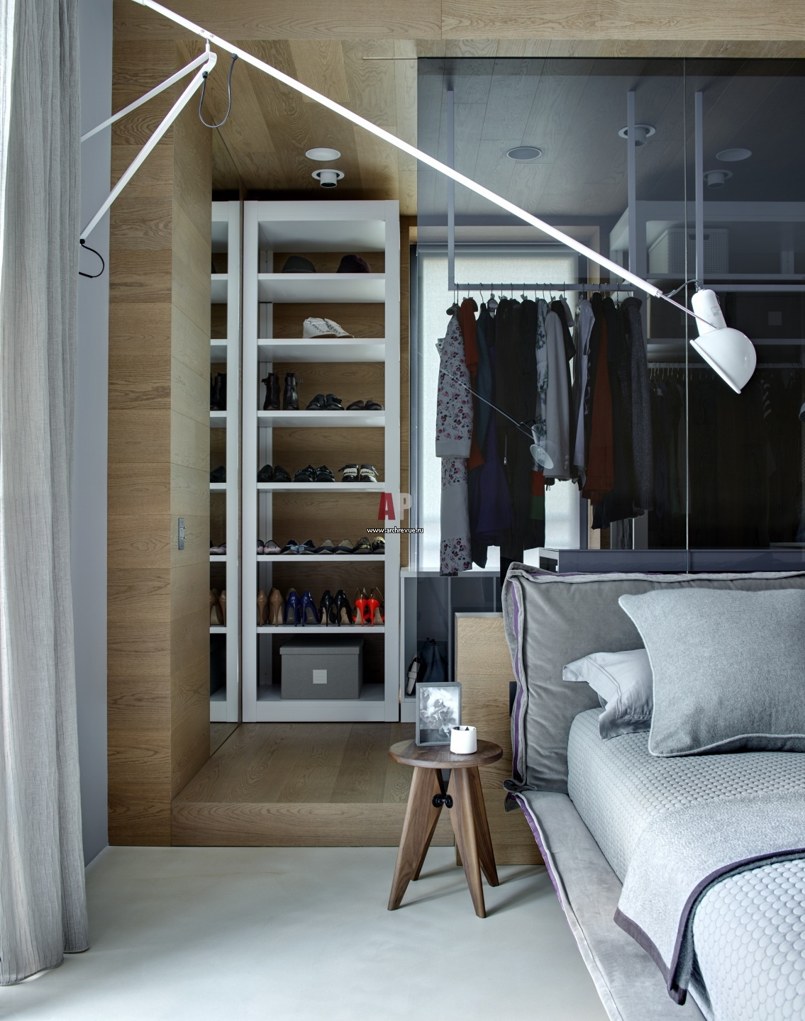Стена за изголовьем кровати в спальне отделана доской из тонированного, «седого» дуба.