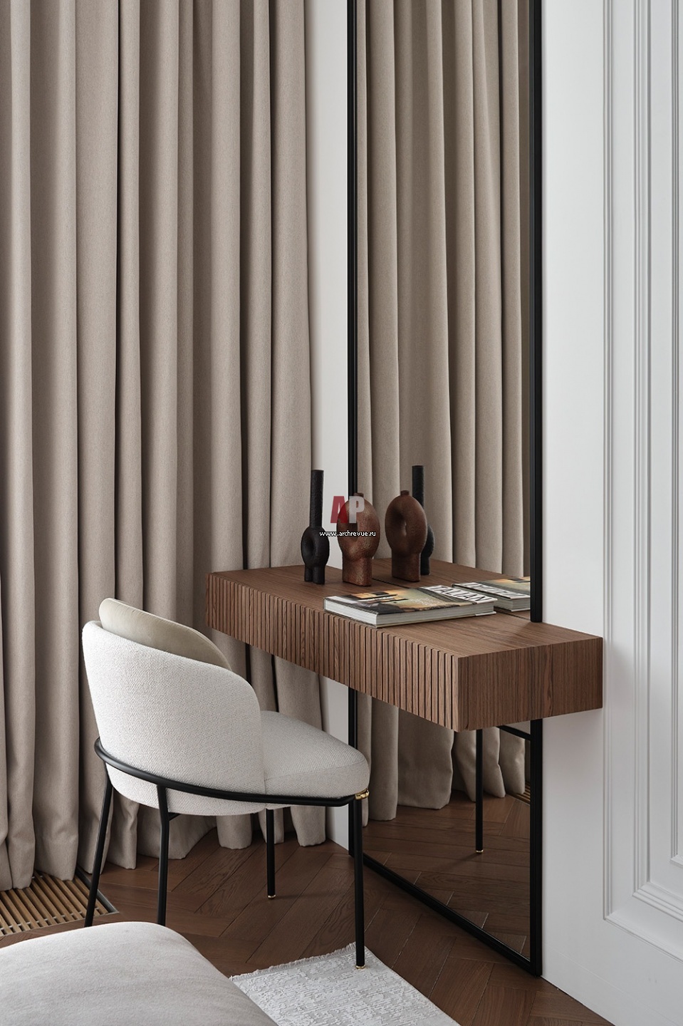 Легкий интерьер семейной квартиры в Хамовниках. Спальня дочери. Небольшое трюмо с зеркалом у окна – туалетный столик или рабочее место для юной девушки.