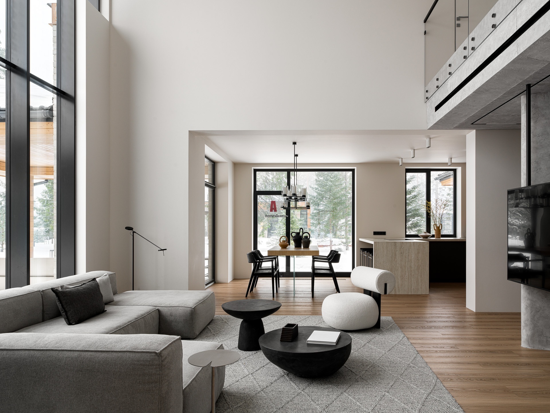 На первом этаже расположена гостиная. В ее основное пространство как будто сверху врезан объект из бетона – перекрытие между первым и вторым этажом.