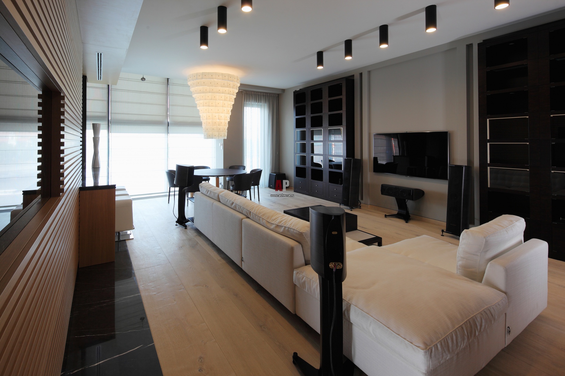 Интерьер общей гостиной с деревянной перегородкой, отделяющий приватную часть. Бруски из дуба создают интересный рельеф. Помещение оснащено профессиональным акустическим оборудованием, Sonus Faber.