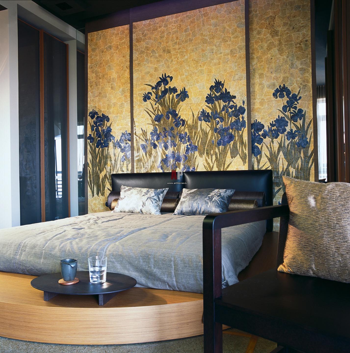 Интерьер спальни. Кровать установлена на круглом подиуме. За изголовьем кровати – раздвижные двери, украшенные авторской росписью с изображением цветущих ирисов.