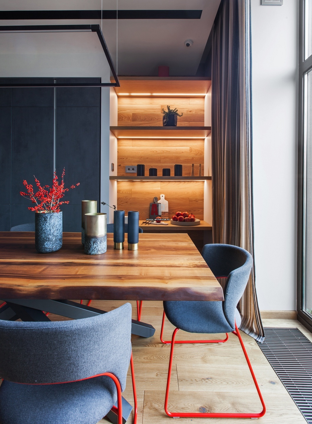 Зона столовой в стиле функциональный минимализм. Стулья с красным основанием, Calligaris, модель New York.