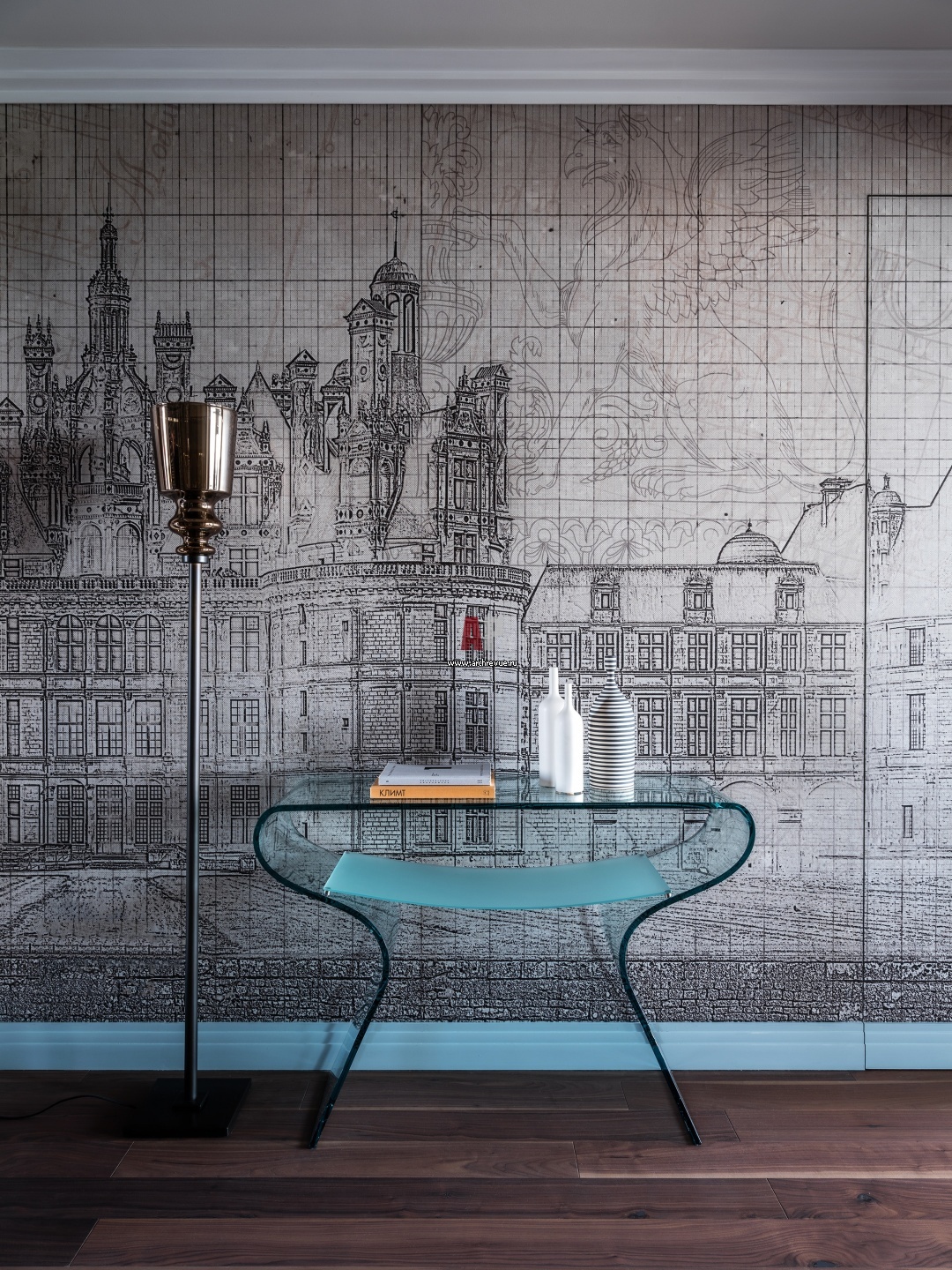Стена в холле напротив оформлена фреской из стекловолокна Inkiostro Bianco с изображением старинного французского шато. С ней гармонирует торшер в виде уличного фонаря и легкая консоль из стекла, Fiam. Слева – дверь-невидимка, ведущая гостевой санузел.