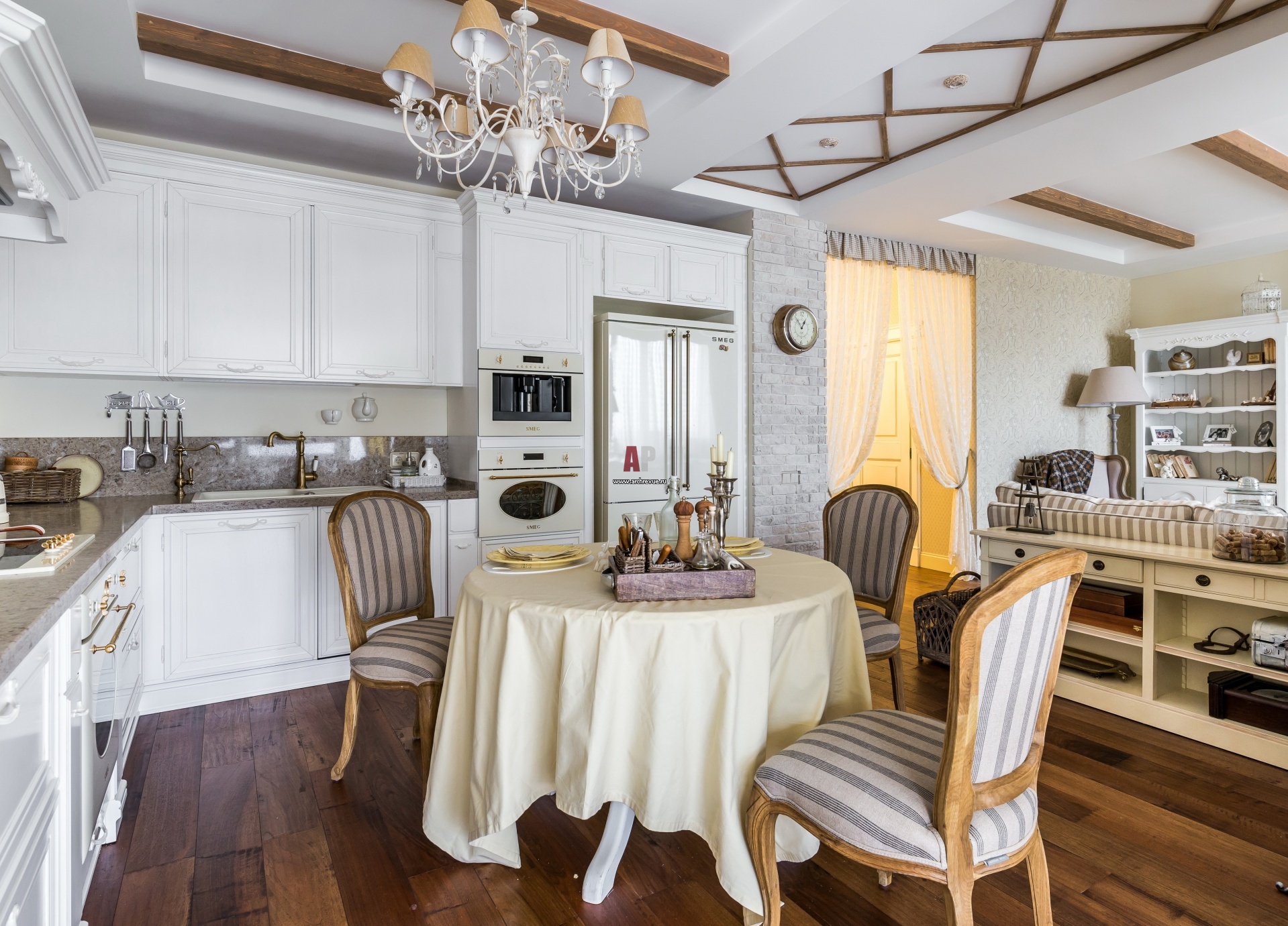Объединенная зона кухни-столовой. Кухня исполнена в белом цвете, Arcari Arredamenti. Обеденный стол и стулья, Dialma Brown.