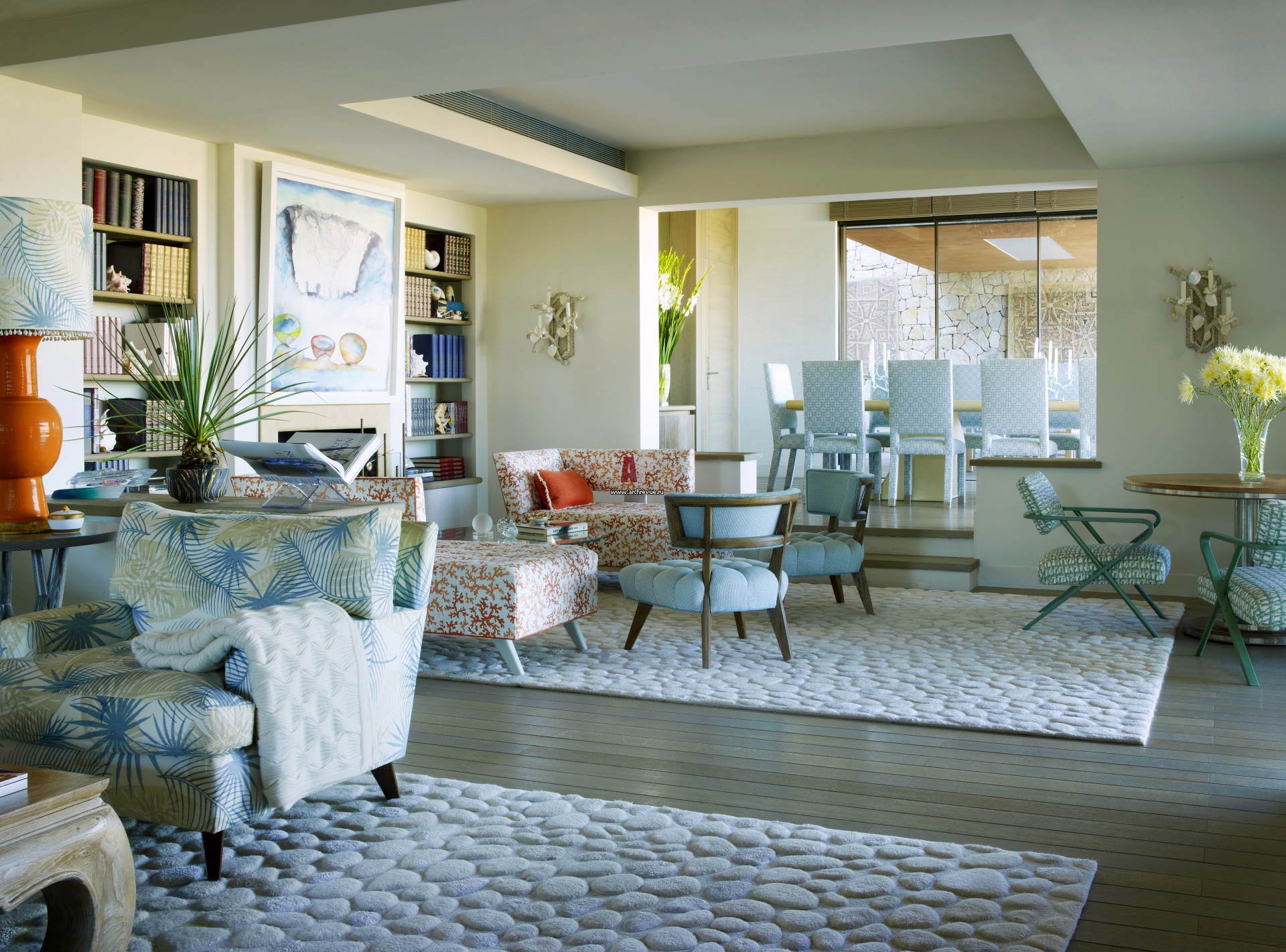 Фото общественной зоны виллы в стиле калифорнийских интерьеров 1950-70-х годов. Ковры в виде гальки сделаны на заказ. Кресла с рисунком в виде пальм – реплика классической модели 1950-х годов дизайна Уильяма Хейнса. Обивка, ткани, Peter Fasano.