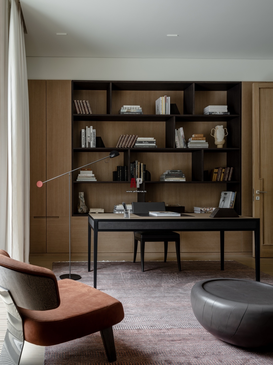 Кабинет. Стол, стул Christian Liaigre. Встроенная мебель – на заказ, по эскизам дизайнера. С текстурой натурального дуба контрастируют изделия из брашированного дуба с насыщенной фактурой.