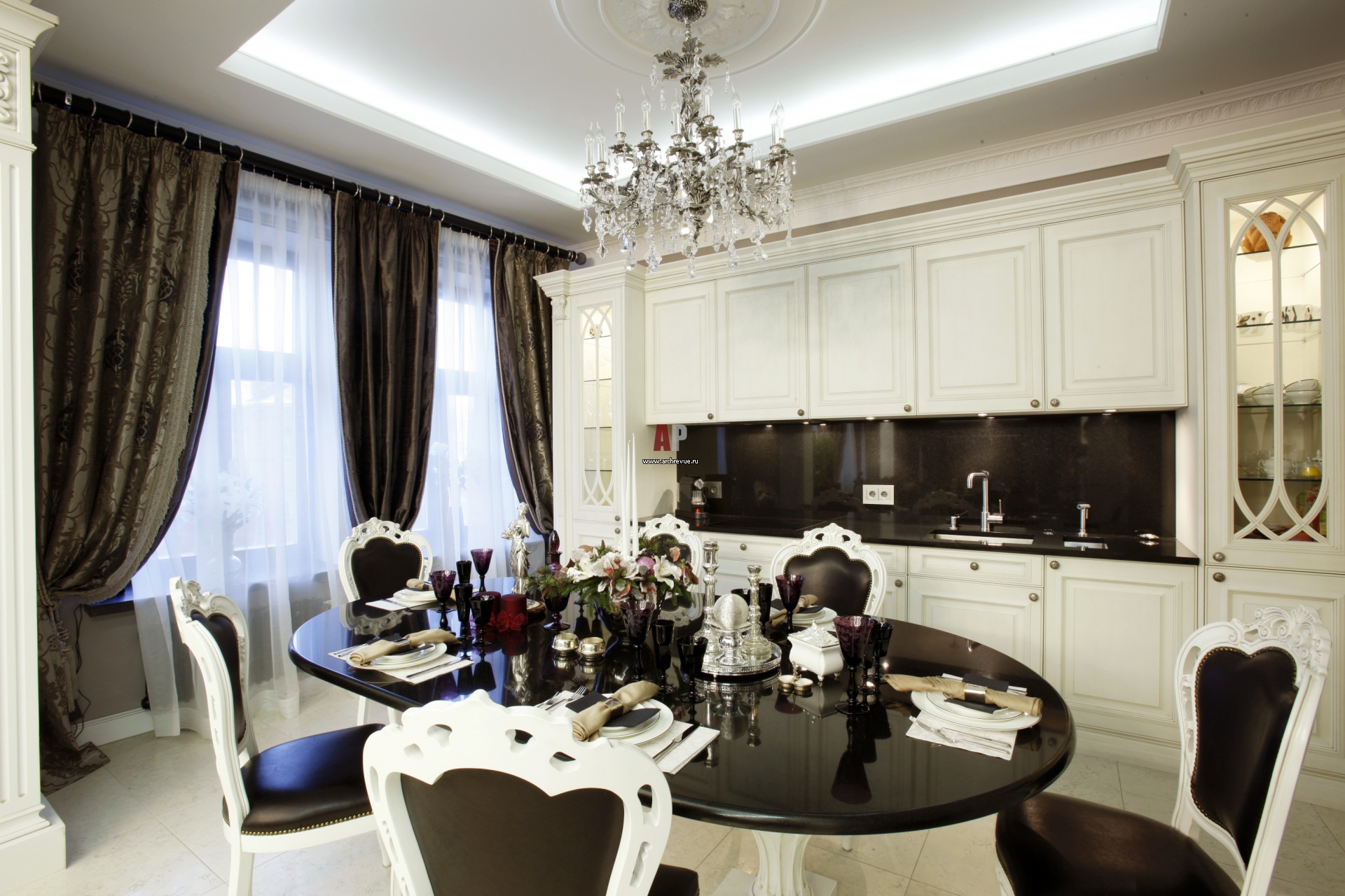 Зона кухни в общей гостиной. Кухонный гарнитур, Neff. С белыми фасадами контрастирует темно-шоколадный кухонный фартук, столешница обеденного стола, обивка стульев и портьеры.