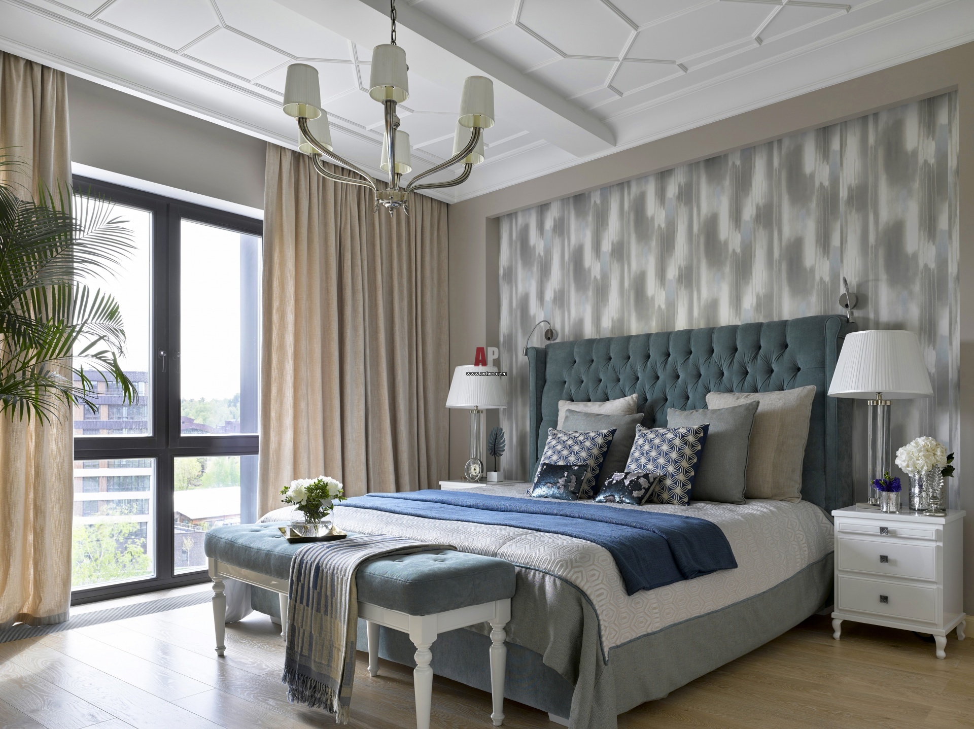 Интерьер хозяйской спальни декорирован в стиле американская неоклассика. Лепной декор на потолке украшает пространство и зрительно нивелирует массивную потолочную балку. Стена за изголовьем кровати оформлена обоями с эффектом струящейся воды. Кровать, Roy Bosh. Прикроватные тумбы и кушетка сделаны на заказ.