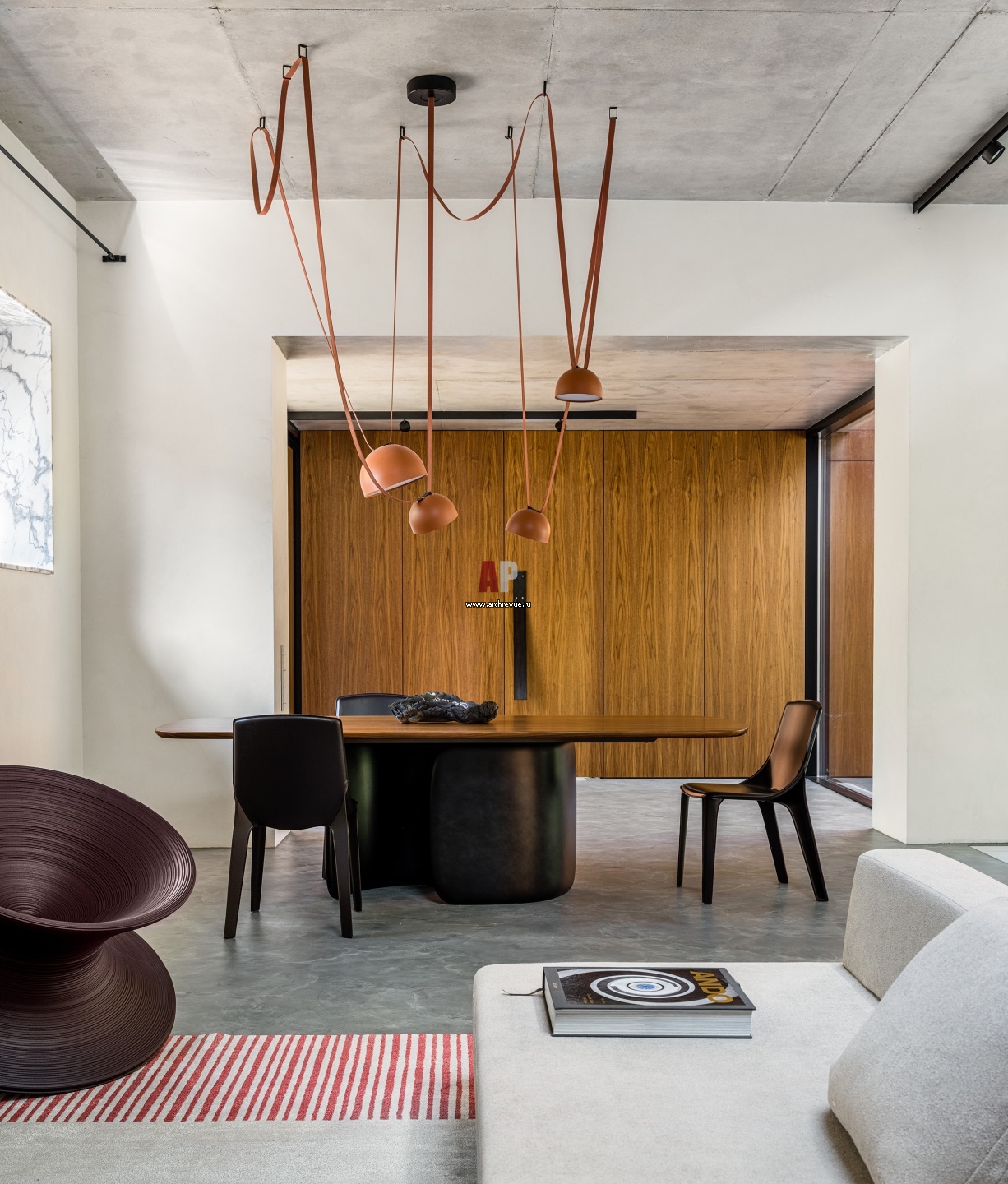 Вид из столовой на входную зону с гардеробной. Фасады, американский орех. Люстра, Vibia.
