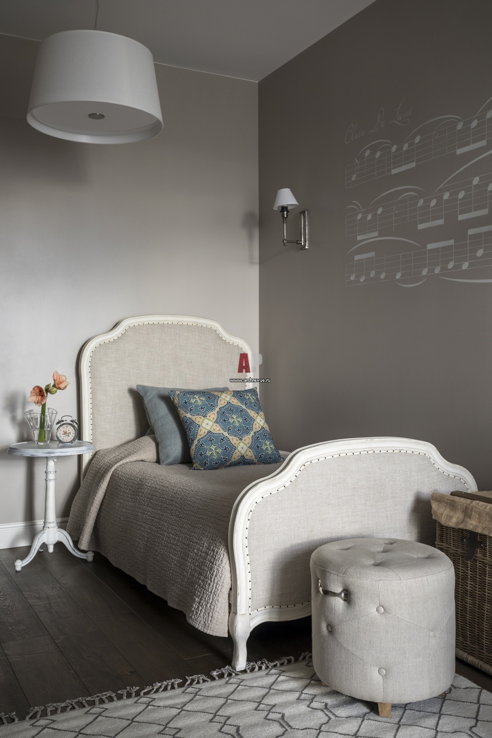 Стену над кроватью в комнате старшей дочери украшает музыкальная фраза из произведения «Лунный свет» Клода Дебюсси. Декоративная роспись «Ноты» выполнена художницей Марией Вейде. Ковер, BoConcept.