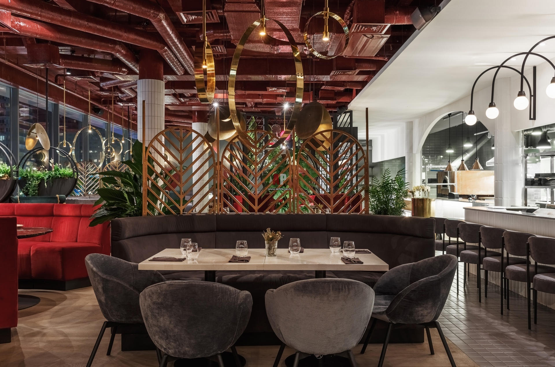 Фото интерьера зала мясного ресторана в насыщенной бордовой гамме. Арочные перегородки из латуни напоминают решетки гриля. Вся мебель и большая часть светильников сделаны на заказ по эскизам дизайнера.