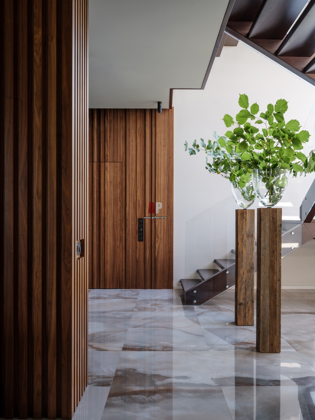 Двухэтажный дом с легким настроением и обилием воздуха. Входная группа с лестницей. На полу – керамогранит под мрамор, Rex.