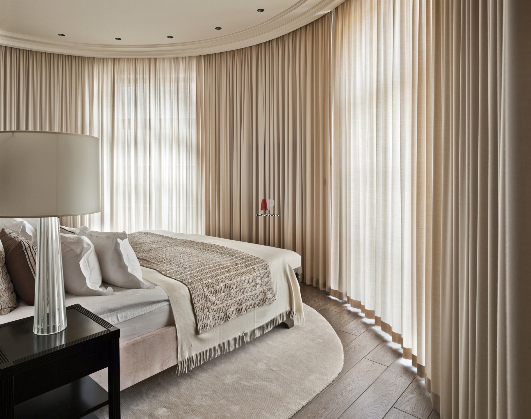 Полукруглая планировка спальни хозяев обыграна с помощью стены, которая делит комнату на две части и одновременно служит изголовьем кровати.