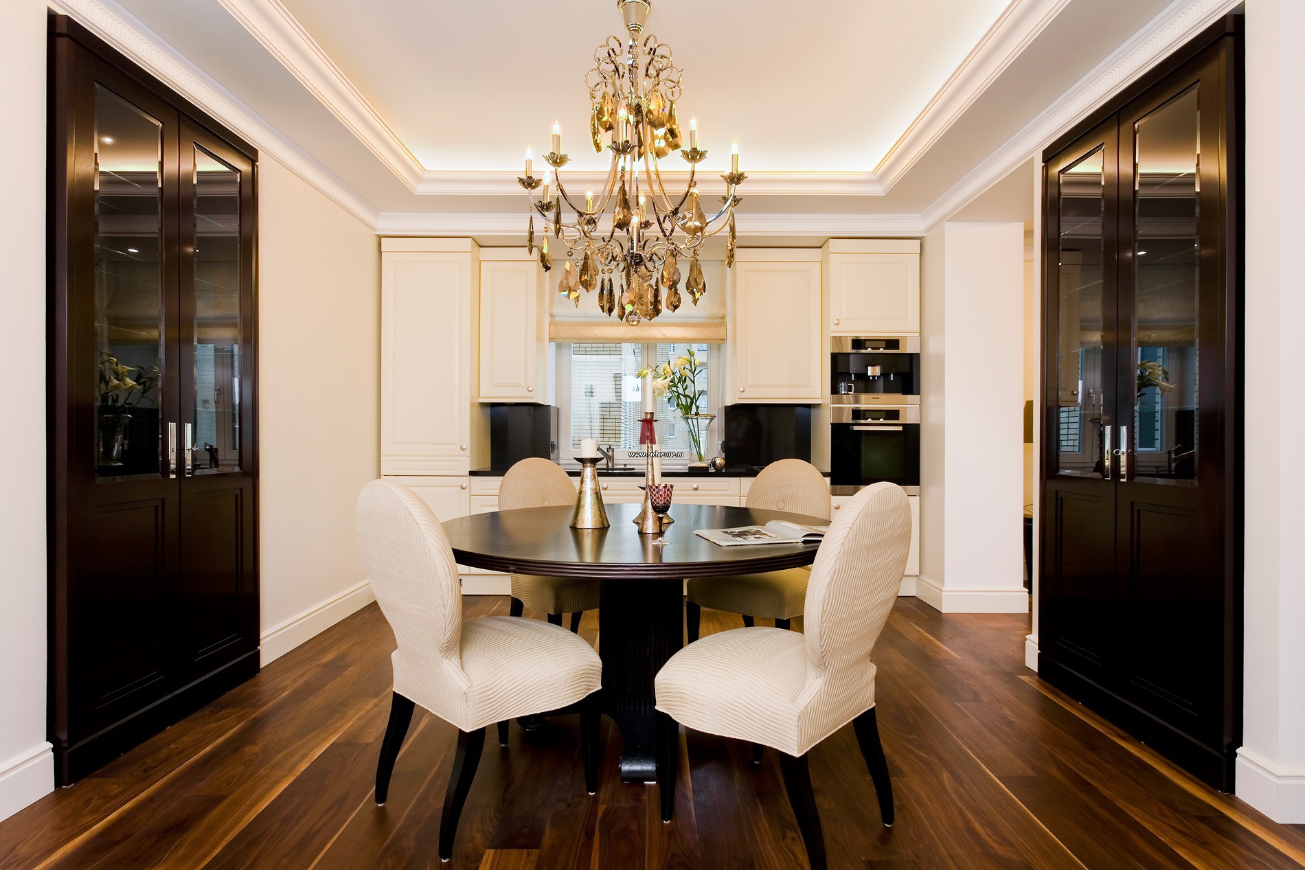 Кухня встроена в пространство вокруг окна. Симметричная мебельная композиция фабрики Zeyko решена в белом цвете. С ней контрастирует отделка «фартука» и бытовой техники черным глянцем. Два встроенных шкафа из дерева цвета «махагон» Form Exclusiv.