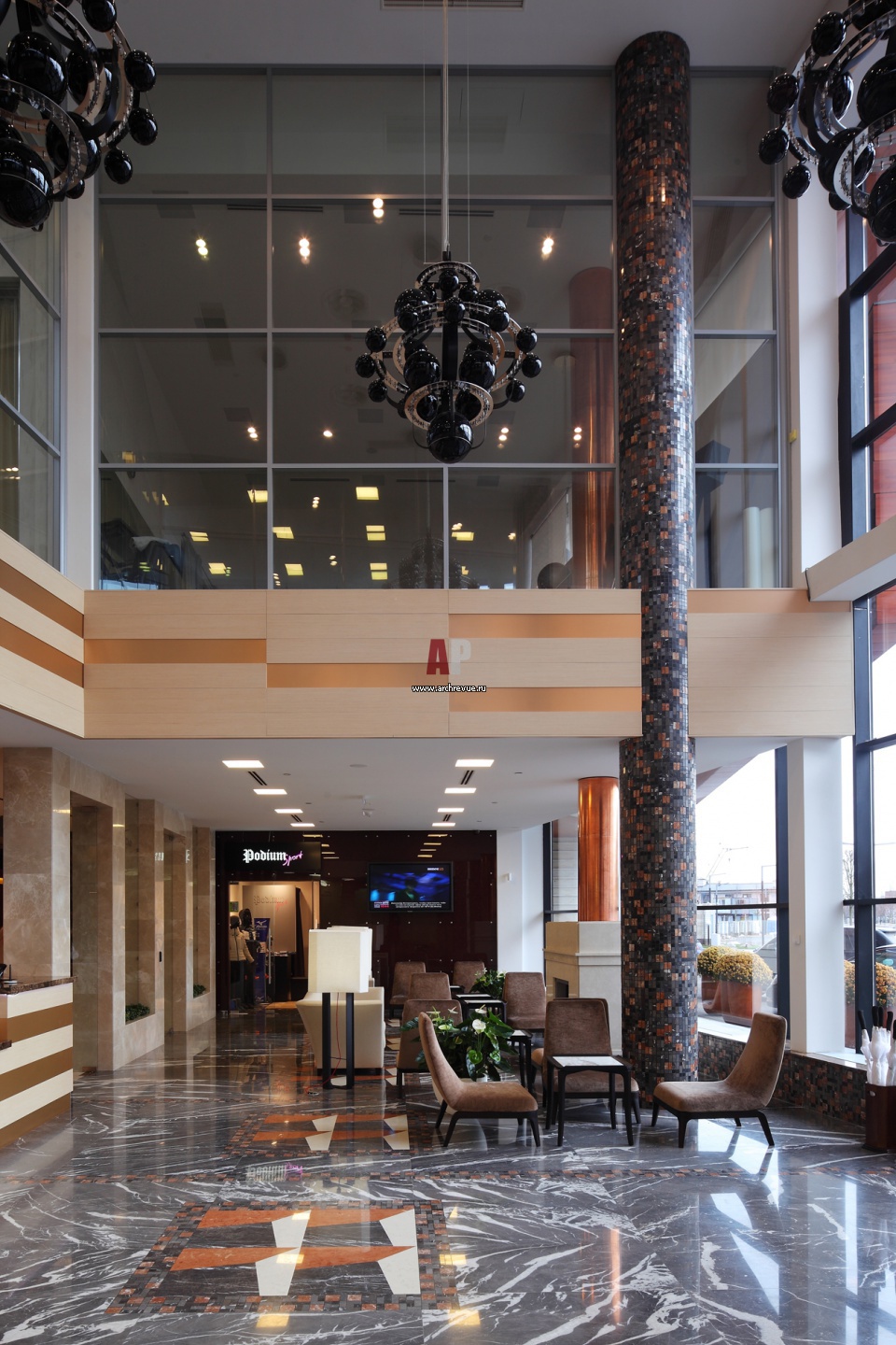 Интерьер входной группы в современном респектабельном стиле. На полах – слэбы натурального камня с инкрустацией. Колонны облицованы каменной мозаикой трех цветов. Мебель, Flexform.