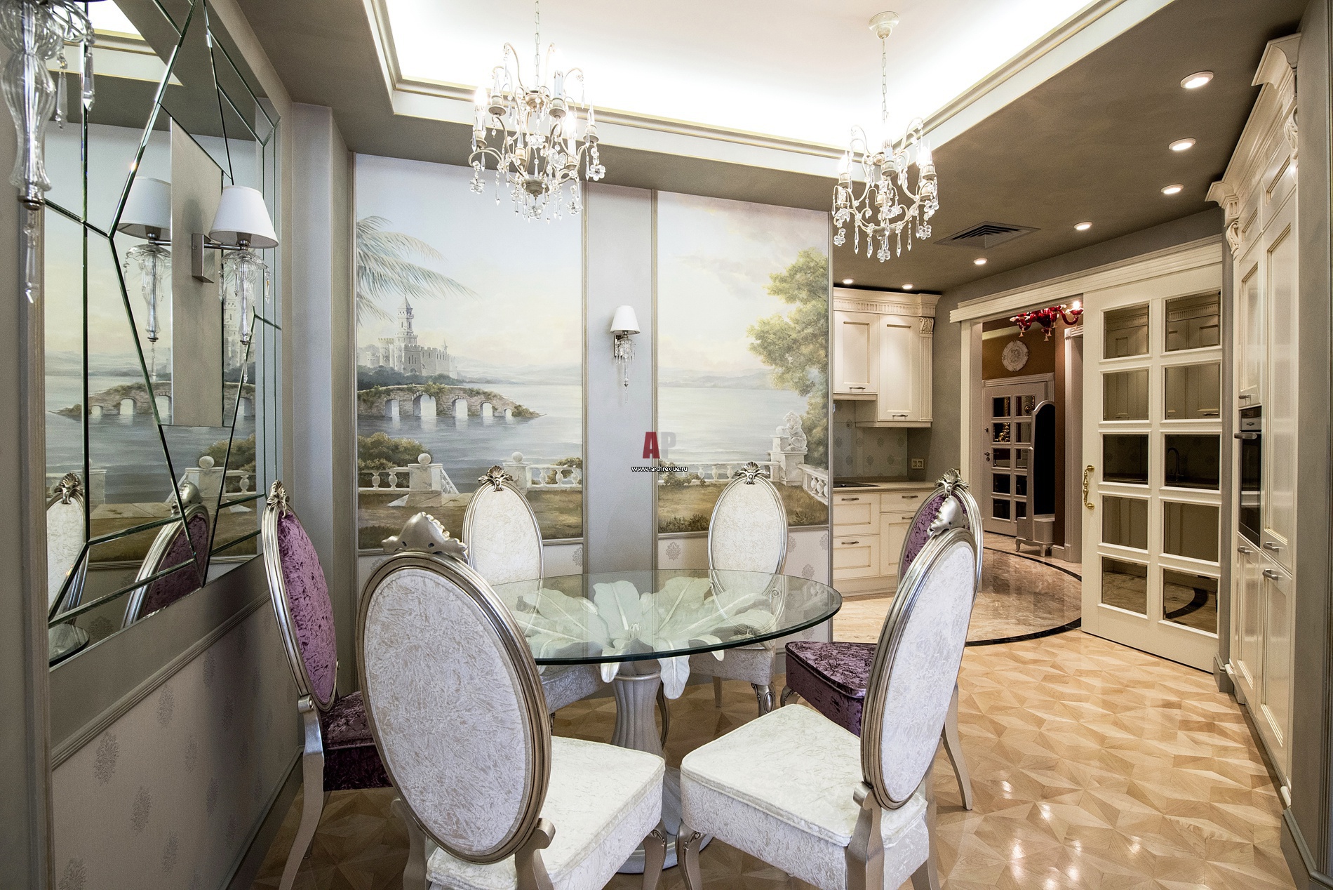 Столовая группа в стиле французской классики. Стол из металла, стеклянная столешница. Потолки украшены декоративными финишами серо-серебристого цвета.