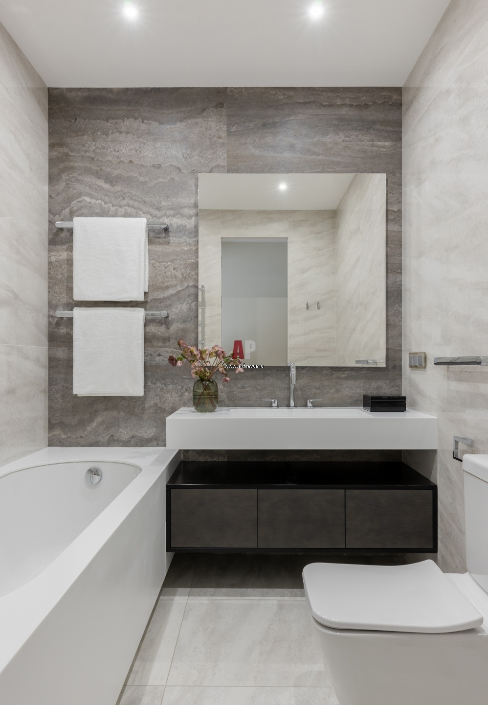 Хозяйская ванная комната. Сантехника, Villeroy & Boch. Тумба под раковину сделана на заказ. Раковина изготовлена акрилового камня. Стены и пол – керамогранит, Casalgrande Padana.