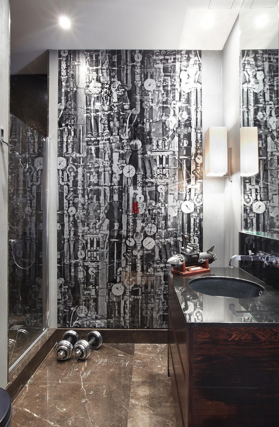 Стену гостевого санузла образует коллаж из механизмов. Напечатанные серебром на сером стекле сантехнические коммуникации, изготовитель Московская студия мастерская шелкографии Б. Бельского – это реальное изображение инженерной разводки за стеной.