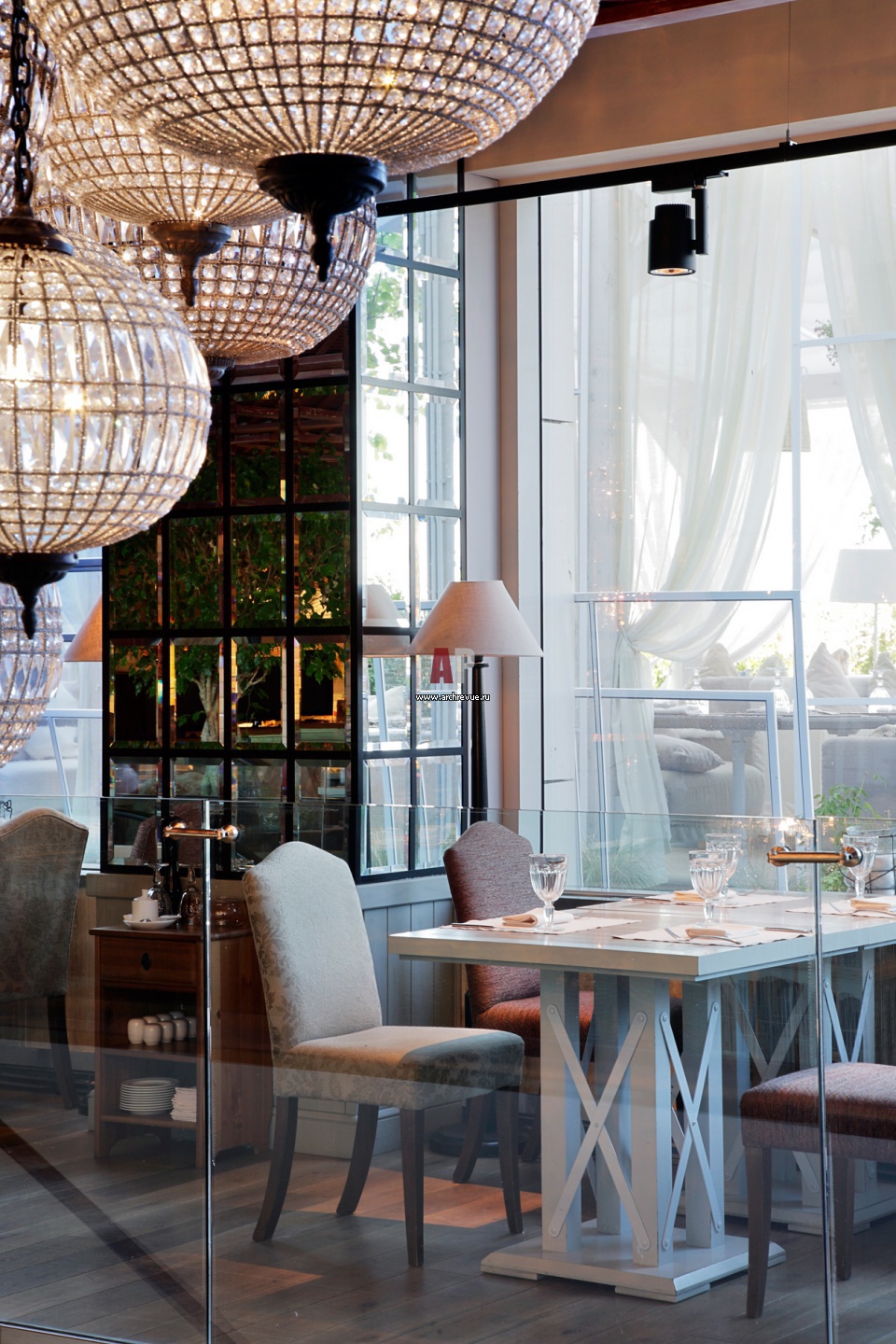 К основному залу ресторана примыкает открытая веранда. Она расположена за стеклянной стеной и ориентирована на город.