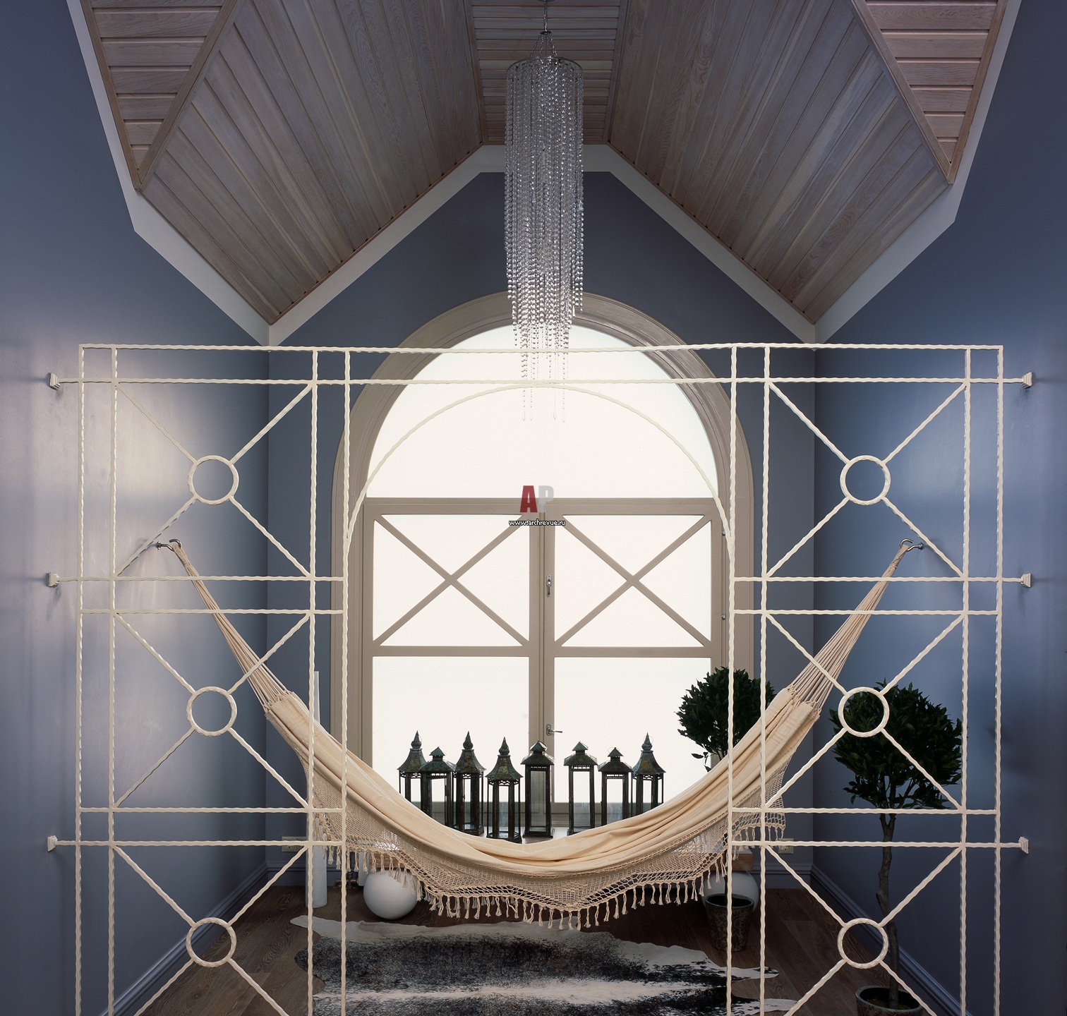 Импровизированный зимний сад находится в холле второго этажа. Его главные украшения – арочное окно, декорированное матированным стеклопакетом с тонкой раскладкой, гамак и металлические ограждения.