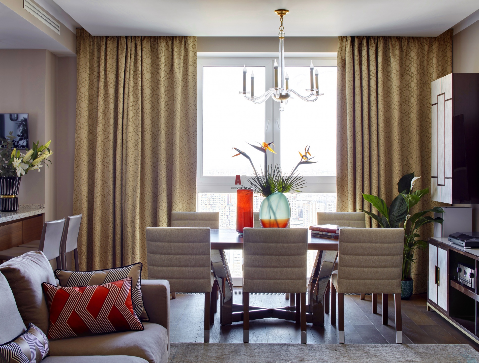Зона столовой в общей гостиной. ТВ консоль и подвесные шкафы выполнены по чертежам Виктории Скляренко: сикомора, глянец, венге, латунь. Обеденный стол и стулья Costantini Pietro, модели Сapture и Aston. Люстра над столом, Visual Comfort & Co, серия E.F.Chapman.