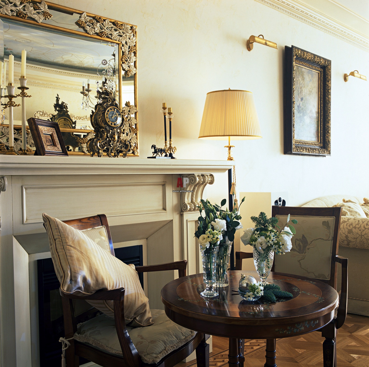 Каминная зона гостиной. Портал камина изготовлен по чертежам архитектора из патинированного дерева на фабрике Martini Mobili. Чайный столик и кресла, BelCor.