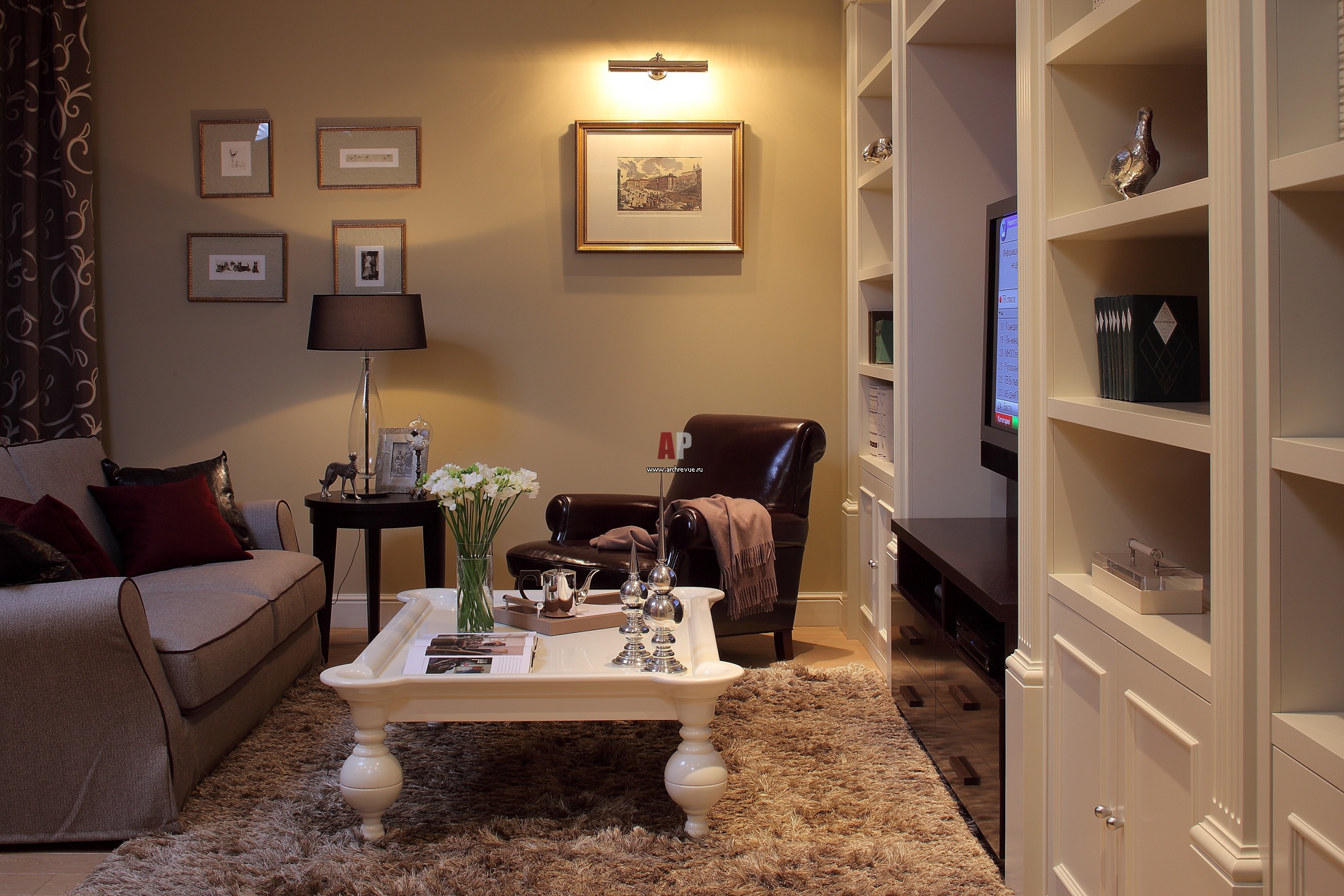 Зона домашнего кинотеатра. ТВ-панель размещена в ячейке встроенного стеллажа-библиотеки, созданной по эскизам архитекторов. Кресло Baxter. Журнальный столик Chelini.
