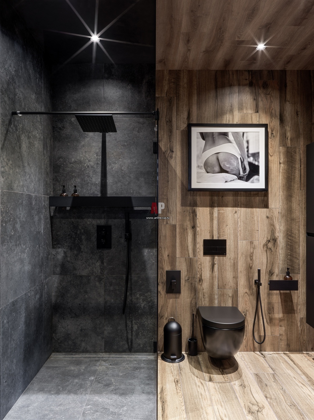 Черный гостевой санузел на первом этаже. Душевое ограждение, Sprinz, серия Inloop. На стенах – керамогранит под дерево и под черный сланец. Постер на стене – работа фотографа Влада Локтева.