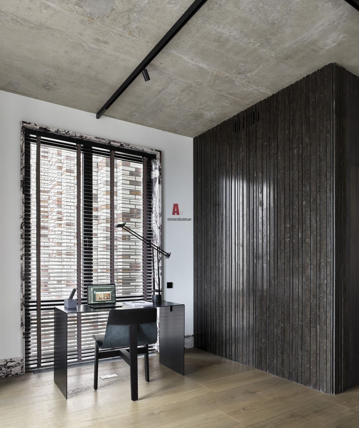 К черному кубу из камня примыкает зона кабинета. Стул, Agapecasa. Письменный стол, Ominimalism.