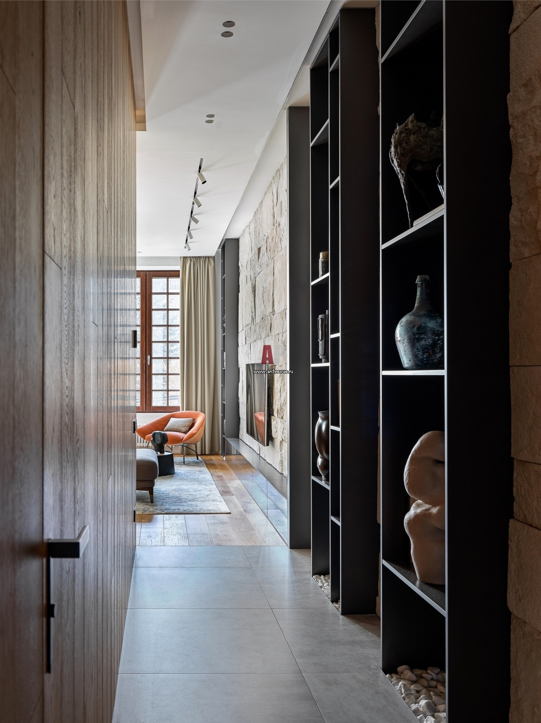 Коридор первого этажа. На первом этаже находится одно жилое помещение – просторный open space, который просматривается от входа. Встроенная мебель, на заказ.