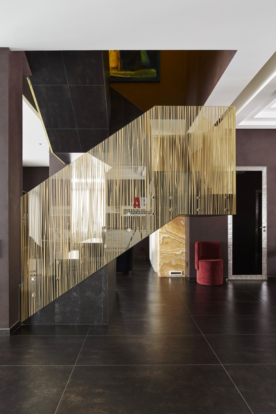 Ступени лестницы облицованы черным сланцем. Ограждение выполнено из стекла с тонким абстрактным золотым рисунком, похожим на струи дождя на стекле.