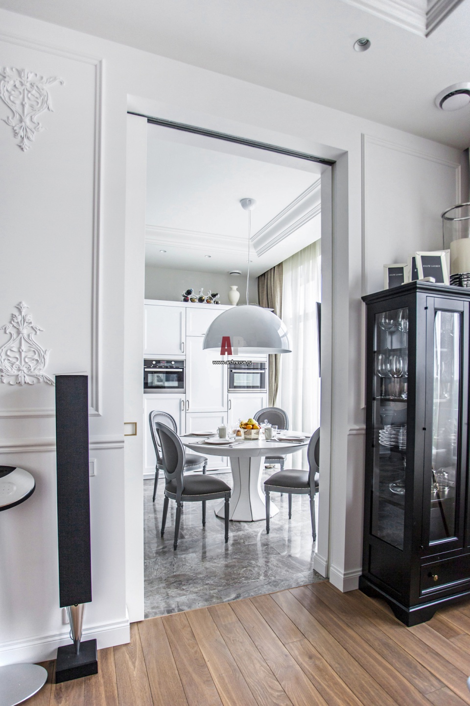 Фото интерьера 4-х комнатной квартиры для семьи с детьми. Кухню от гостиной отделяют раздвижные двери, что позволяет с лёгкостью при необходимости объединять комнаты. На белых стенах – декоративные гипсовые розетки.