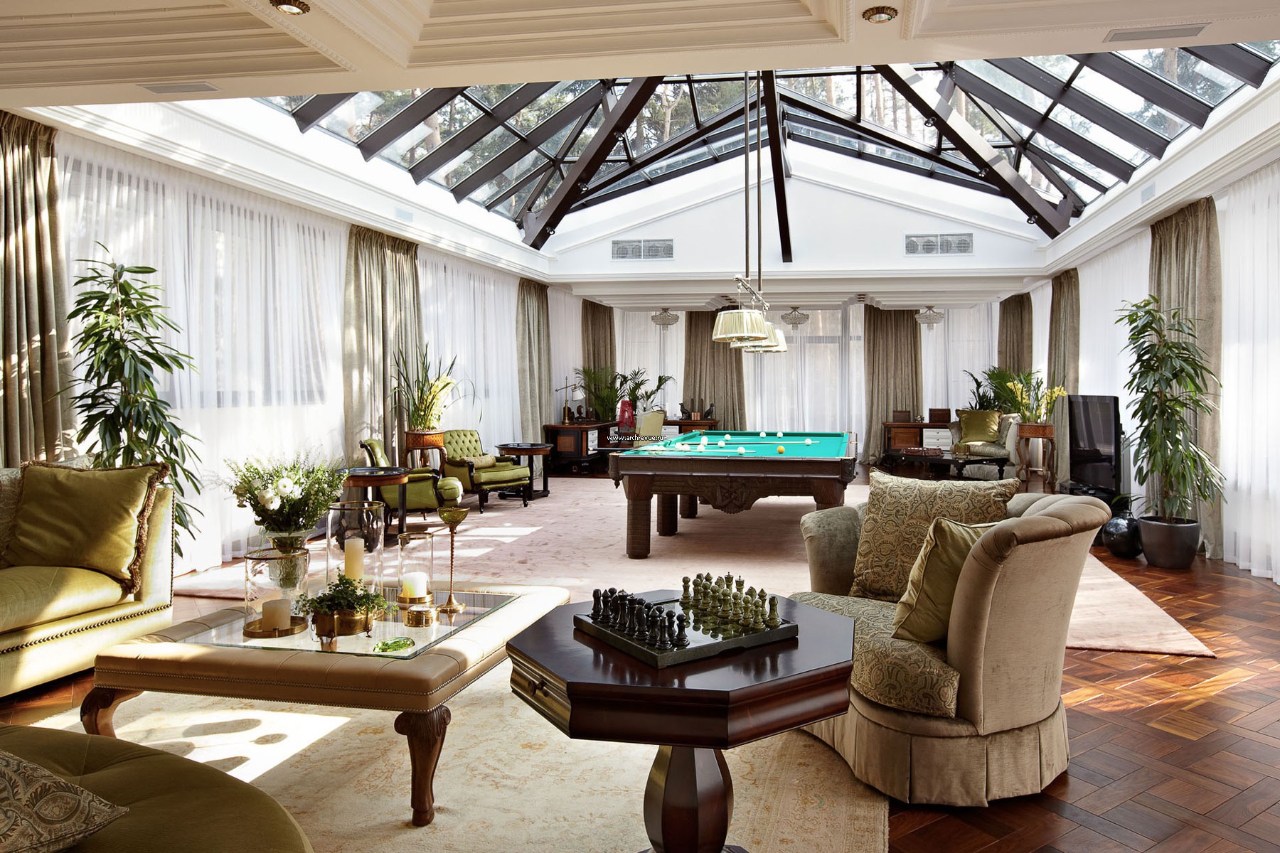 Закрытая веранда дома объединяет зимний сад и игровую зону с местом для работы и релакса.