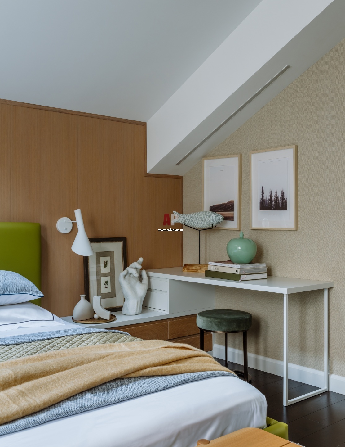 Небольшой семейный дом в Подмосковье. Хозяйская спальня. Почти вся мебель в доме сделана на заказ по эскизам дизайнера.