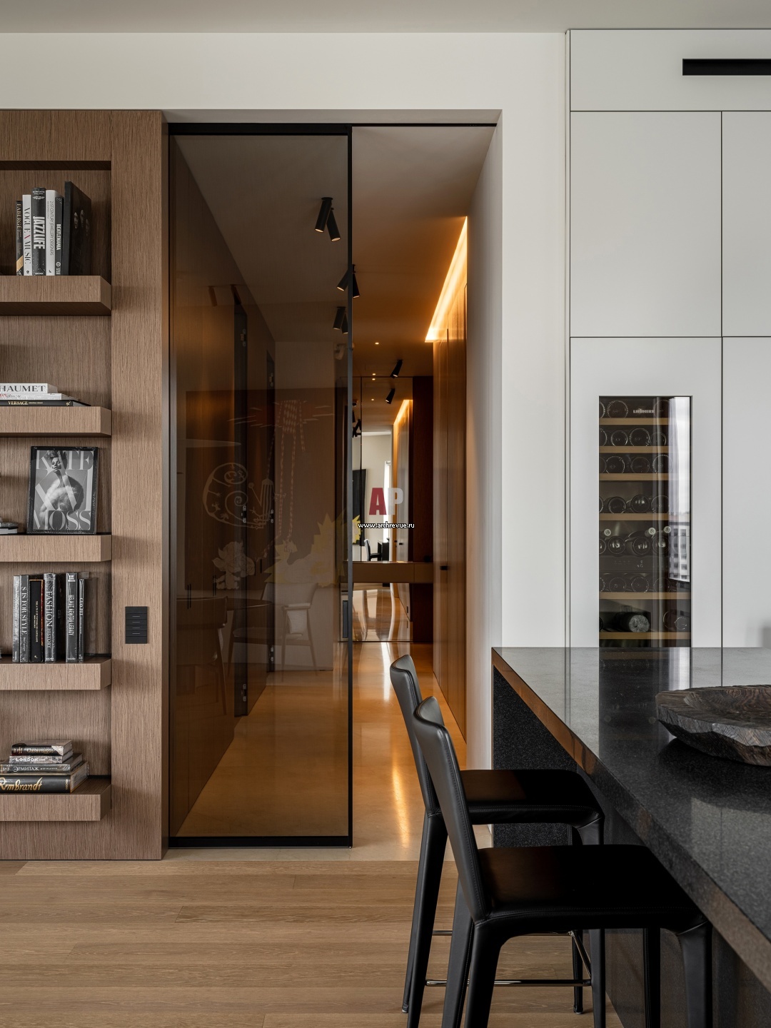 Одно из пожеланий заказчиков – большое количество встроенных систем хранения. В гостиной сделан высокий стеллаж с открытыми полками, в спальнях и коридоре – скрытые дубовыми панелями гардеробные.